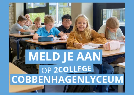 Vanaf 2 maart is het mogelijk je aan te melden op 2College Cobbenhagenlyceum. Je geeft voor 20 maart via LDOS, het centrale aanmeldsysteem, aan naar welke school je het liefst gaat. Hopelijk is dat bij ons!