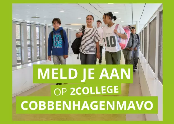 Vanaf 2 maart is het mogelijk je aan te melden op 2College Cobbenhagenmavo. Je geeft voor 20 maart via LDOS, het centrale aanmeldsysteem, aan naar welke school je het liefst gaat. Hopelijk is dat bij ons!