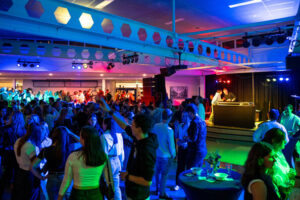 Even verderop is een groepje jongens van dezelfde leeftijd op zoek naar meneer Arts. ‘Dat was echt een toffe mentor’ vinden ze. ‘Hopelijk is hij er vanavond ook.’ Dan klinkt er opeens veel geluid vanuit de bomvolle aula waar de docentenband is aangetreden. Vol verve zetten zij samen met zangeressen mevrouw Van der Sterre en mevrouw Groenen een spetterend optreden neer. Ook meneer Leermakers van wiskunde laat van zich horen. Extra leuk is de reünie van oud BLACK-leden.